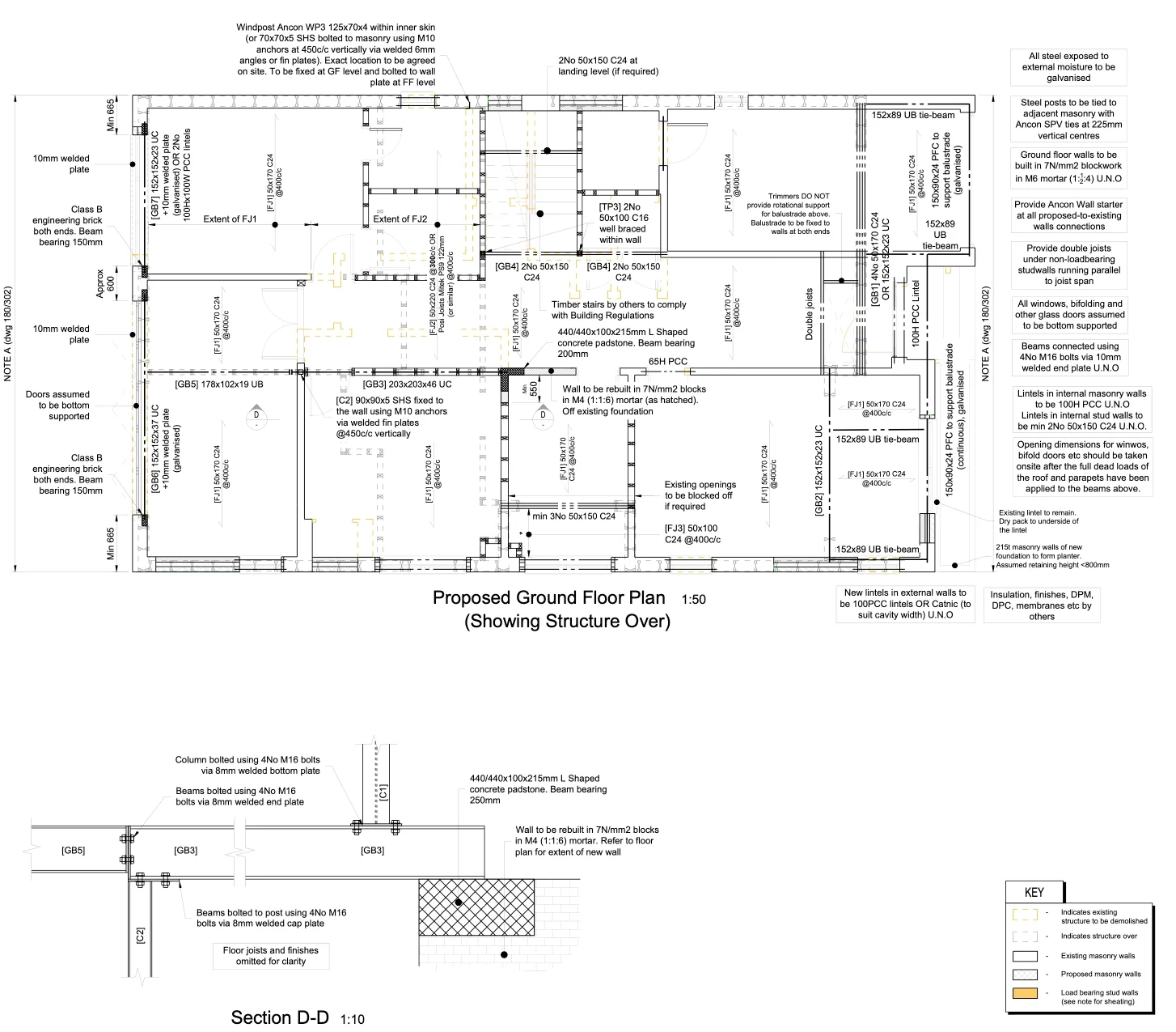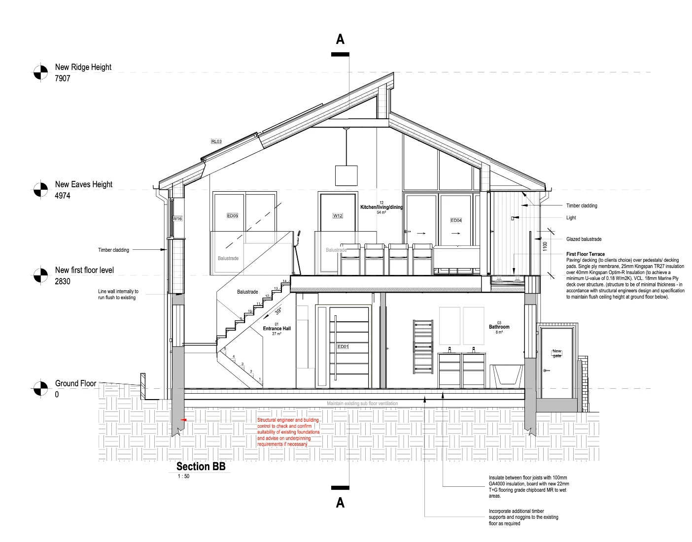 Extensive remodelling of an existing bungalow, including the addition of a new upper storey to capture sea views. The design utilised load-bearing masonry walls, timber stud partitions, and integrated steel beams to create open internal layouts while maintaining structural efficiency and stability.