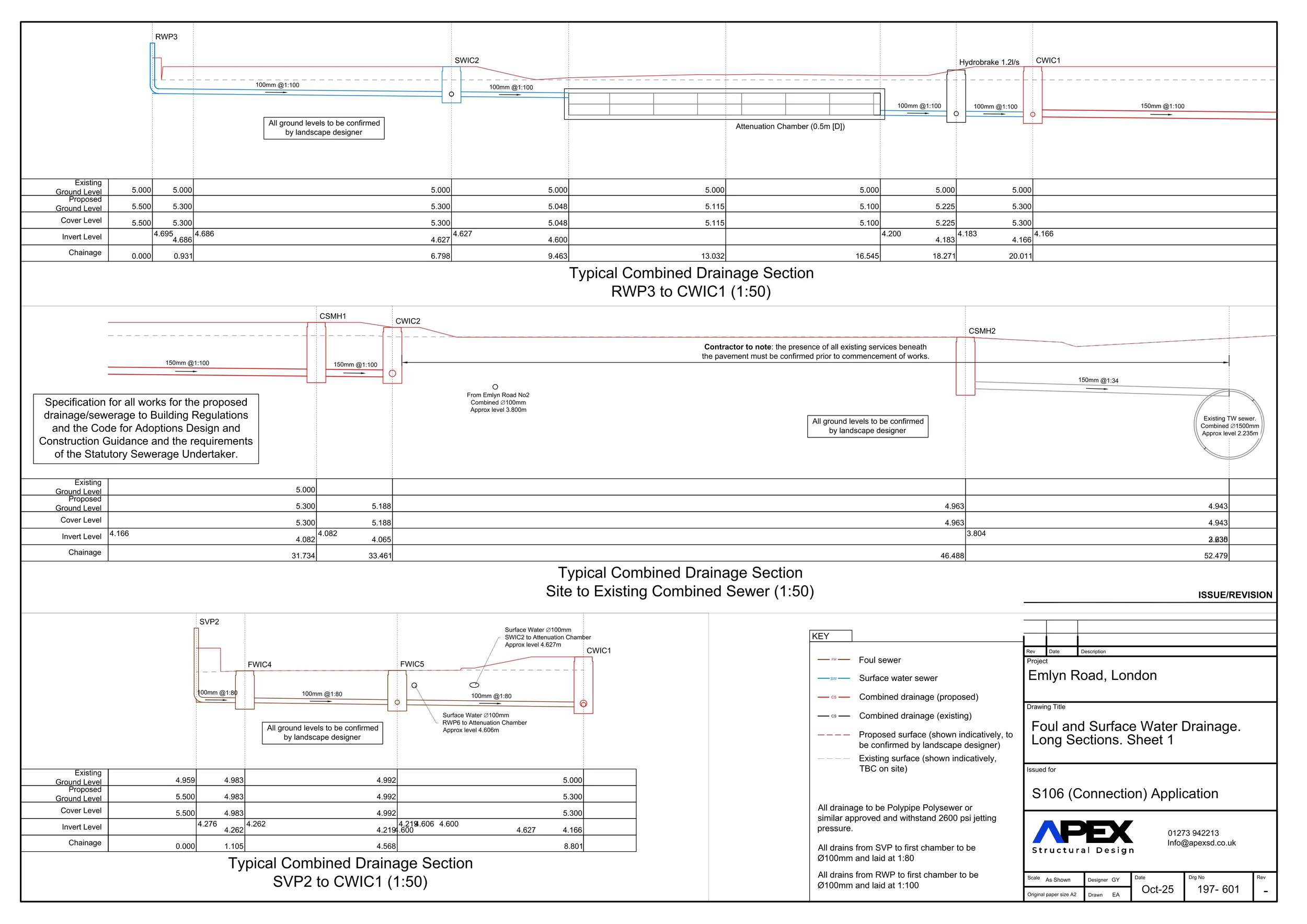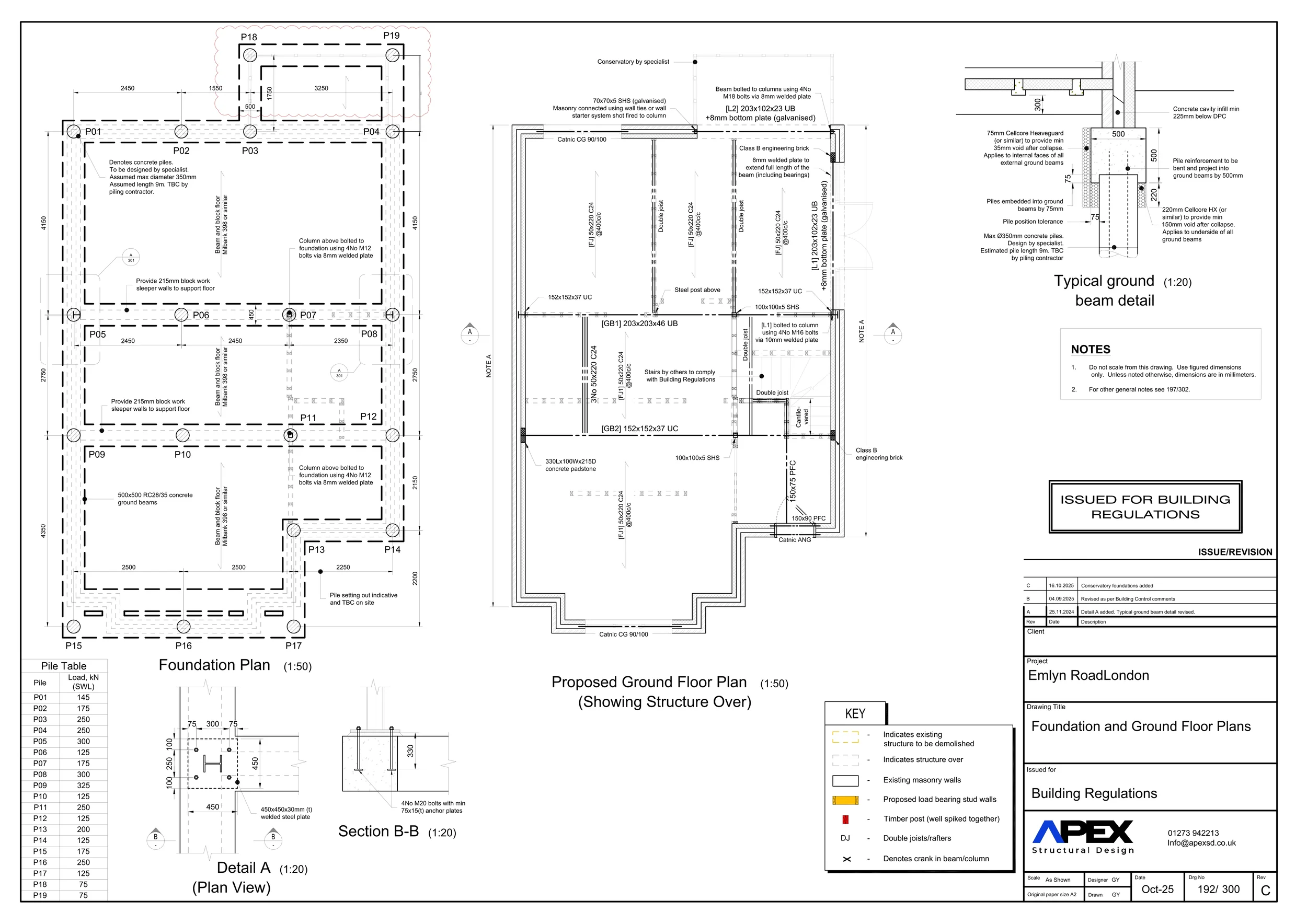 Structural and civil design for a three-storey detached dwelling featuring load-bearing masonry and a steel frame to form open internal layouts. Due to over 2 m of made ground and poor bearing conditions, foundations were designed as reinforced concrete ground beams on piles. The scope also included below-ground foul and surface water drainage design, which required resolving a complex connection approval process after Thames Water initially refused discharge to the nearest sewer.